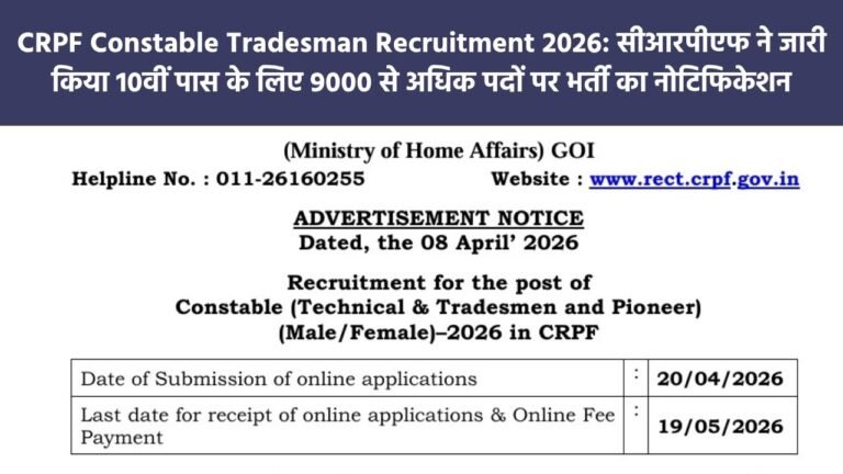 CRPF Constable Tradesman Recruitment 2026: सीआरपीएफ ने जारी किया 10वीं पास के लिए 9000 से अधिक पदों पर भर्ती का नोटिफिकेशन
